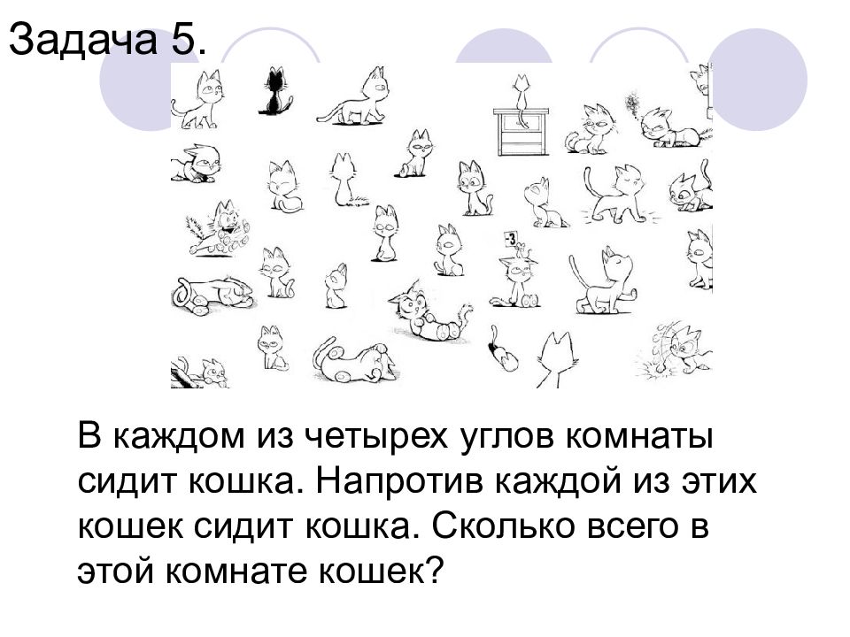 В каждом из четырех углов комнаты сидит кошка. Напротив каждой из этих кошек сидит кошка. Сколько всего в этой комнате кошек? Задача 5.