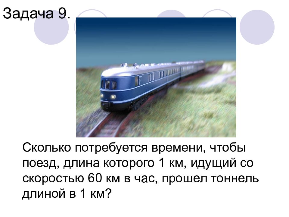 Сколько потребуется времени, чтобы поезд, длина которого 1 км, идущий со скоростью 60 км в час, прошел тоннель длиной в 1 км? Задача 9.
