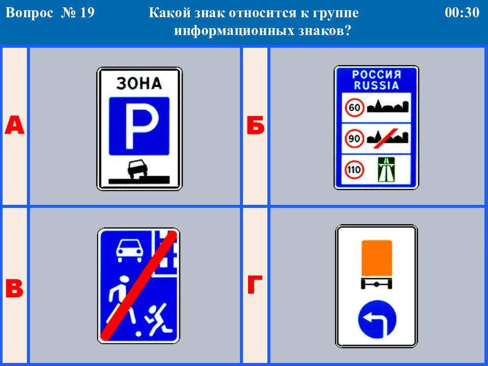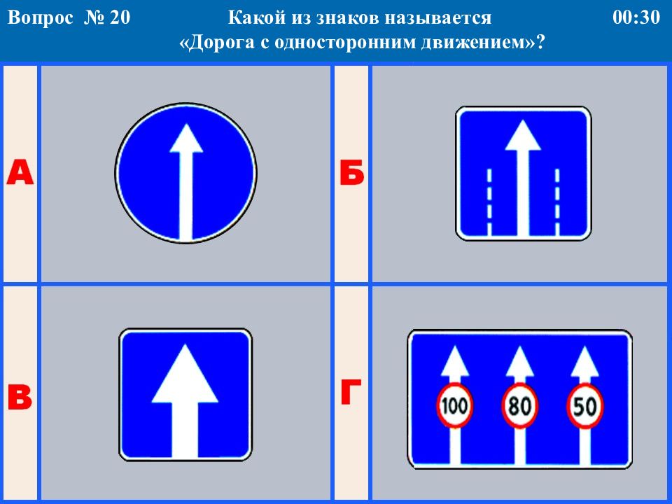Какой из знаков называется «Дорога с односторонним движением»? Вопрос № 20 00:30