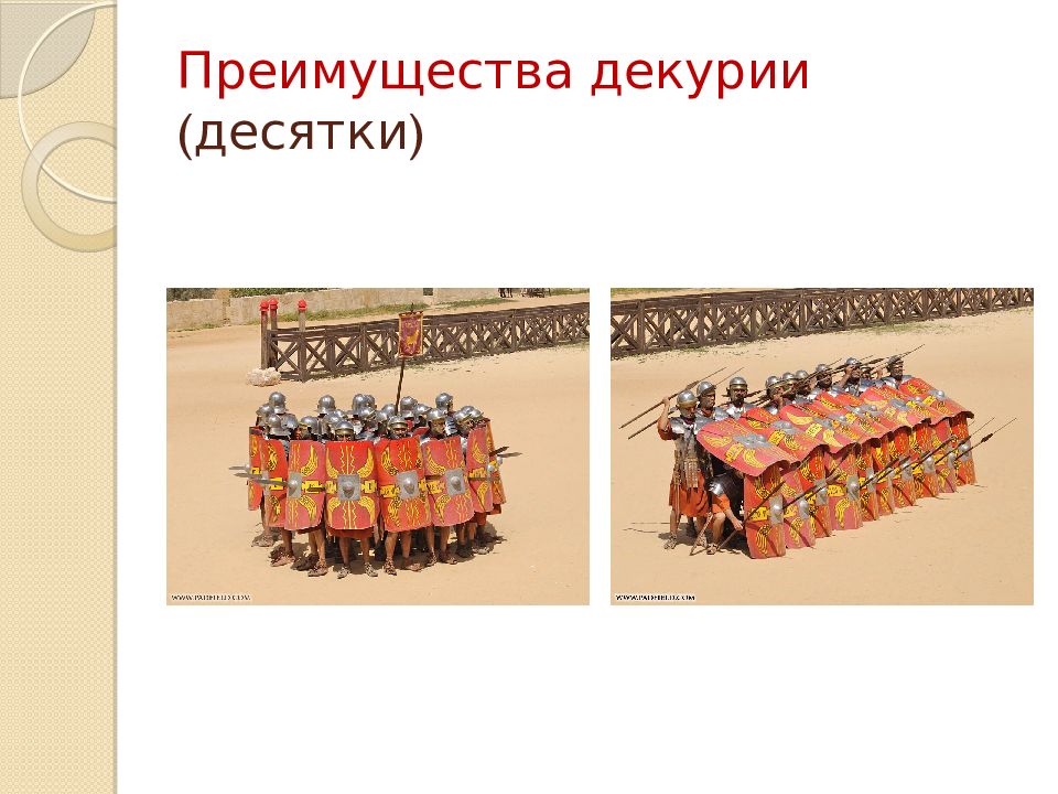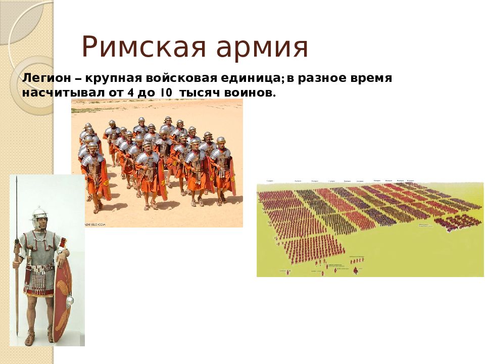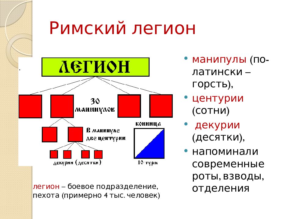 манипулы ( по-латински – горсть), центурии (сотни) декурии (десятки), напоминали современные роты, взводы, отделения . легион – боевое подразделение, пехота (примерно 4 тыс. человек)