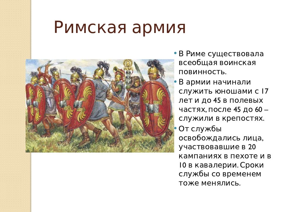 В Риме существовала всеобщая воинская повинность. В армии начинали служить юношами с 17 лет и до 45 в полевых частях, после 45 до 60 – служили в крепостях. От службы освобождались лица, участвовавшие в 20 кампаниях в пехоте и в 10 в кавалерии. Сроки службы со временем тоже менялись.