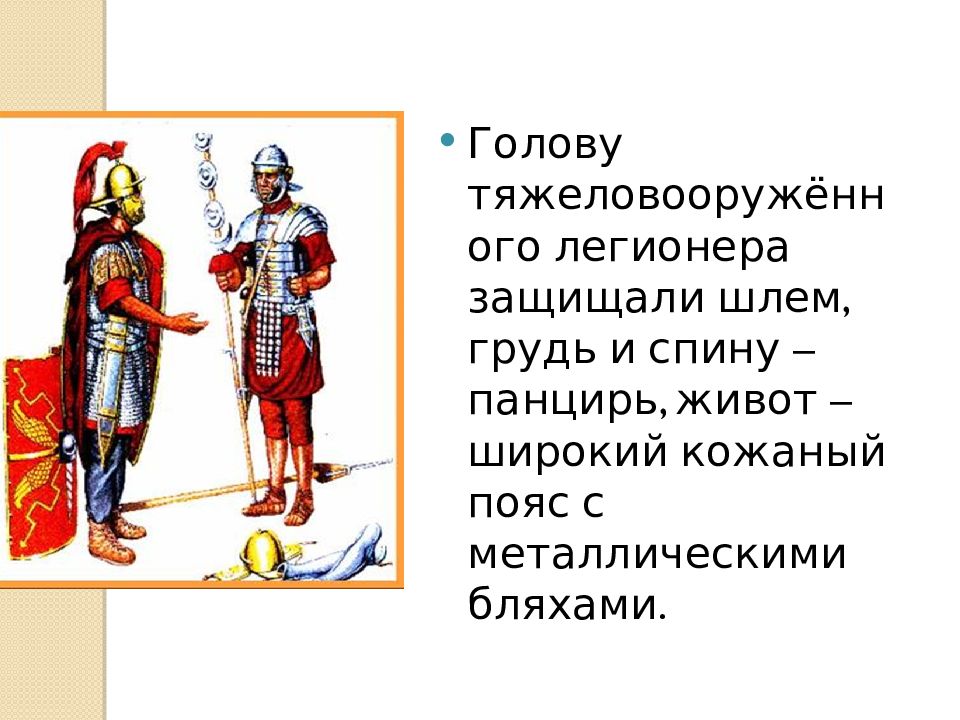 Голову тяжеловооружённого легионера защищали шлем, грудь и спину – панцирь, живот – широкий кожаный пояс с металлическими бляхами.