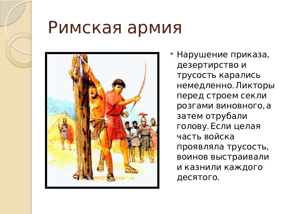 Нарушение приказа, дезертирство и трусость карались немедленно. Ликторы перед строем секли розгами виновного, а затем отрубали голову. Если целая часть войска проявляла трусость, воинов выстраивали и казнили каждого десятого.