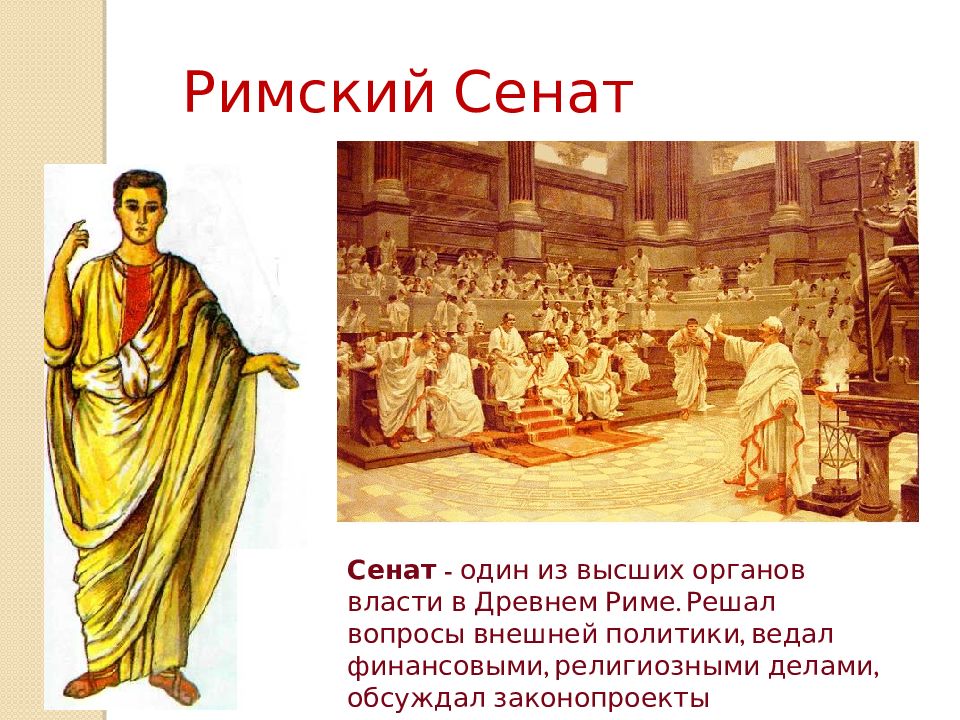 Сенат - один из высших органов власти в Древнем Риме. Решал вопросы внешней политики, ведал финансовыми, религиозными делами, обсуждал законопроекты