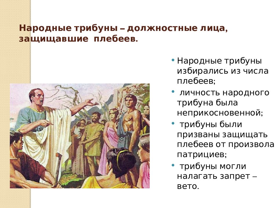 Народные трибуны избирались из числа плебеев; личность народного трибуна была неприкосновенной; трибуны были призваны защищать плебеев от произвола патрициев; трибуны могли налагать запрет – вето.
