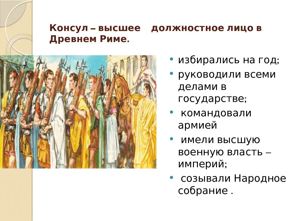 Слайд 2: Консул – высшее должностное лицо в Древнем Риме