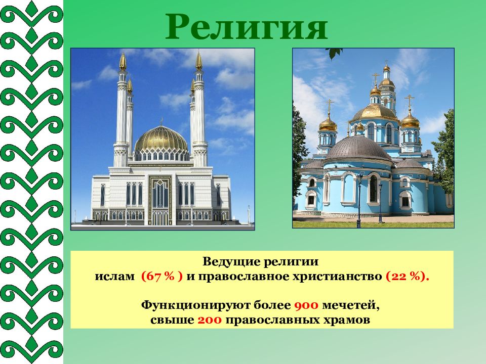 Религия Ведущие религии ислам (67 % ) и православное христианство (22 %). Функционируют более 900 мечетей, свыше 200 православных храмов