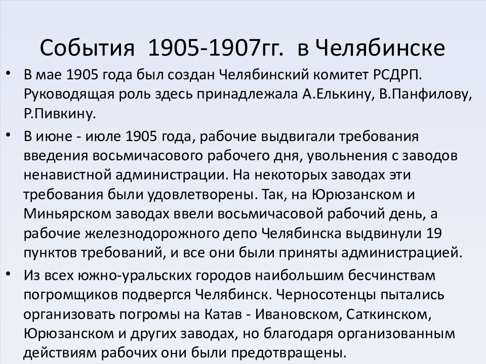 В мае 1905 года был создан Челябинский комитет РСДРП. Руководящая роль здесь принадлежала А.Елькину, В.Панфилову, Р.Пивкину. В июне - июле 1905 года, рабочие выдвигали требования введения восьмичасового рабочего дня, увольнения с заводов ненавистной администрации. На некоторых заводах эти требования были удовлетворены. Так, на Юрюзанском и Миньярском заводах ввели восьмичасовой рабочий день, а рабочие железнодорожного депо Челябинска выдвинули 19 пунктов требований, и все они были приняты администрацией. Из всех южно-уральских городов наибольшим бесчинствам погромщиков подвергся Челябинск. Черносотенцы пытались организовать погромы на Катав - Ивановском, Саткинском, Юрюзанском и других заводах, но благодаря организованным действиям рабочих они были предотвращены.