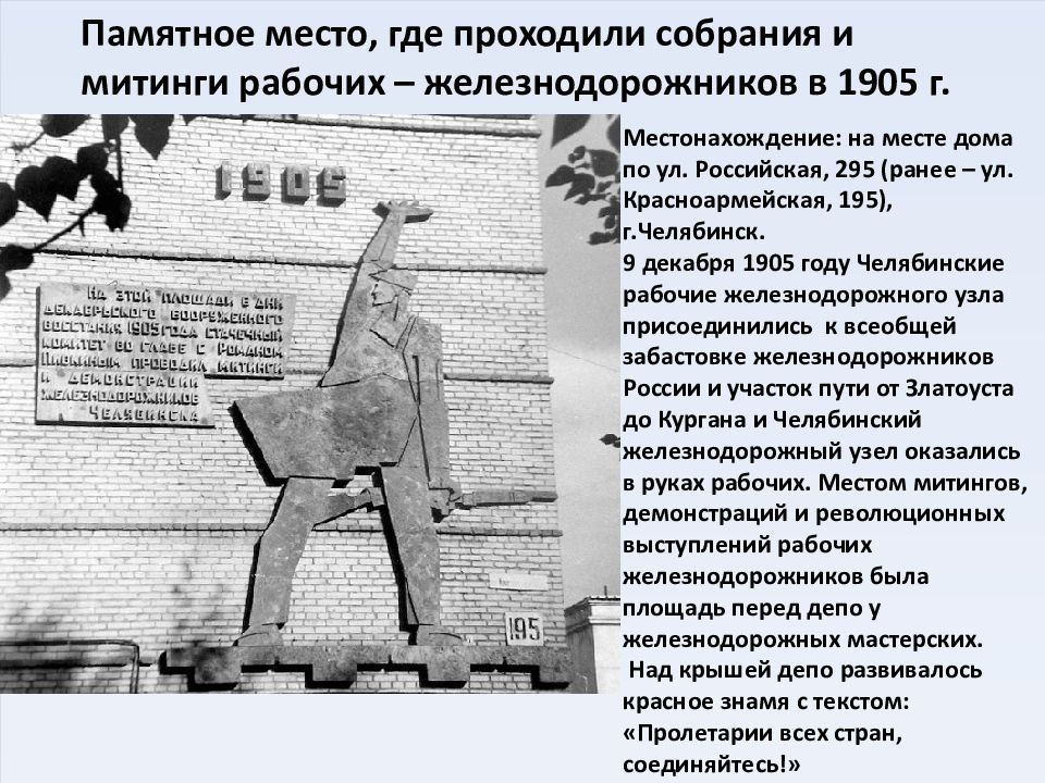 Памятное место, где проходили собрания и митинги рабочих – железнодорожников в 1905 г. Местонахождение: на месте дома по ул. Российская, 295 (ранее – ул. Красноармейская, 195), г.Челябинск. 9 декабря 1905 году Челябинские рабочие железнодорожного узла присоединились к всеобщей забастовке железнодорожников России и участок пути от Златоуста до Кургана и Челябинский железнодорожный узел оказались в руках рабочих. Местом митингов, демонстраций и революционных выступлений рабочих железнодорожников была площадь перед депо у железнодорожных мастерских. Над крышей депо развивалось красное знамя с текстом: «Пролетарии всех стран, соединяйтесь!»