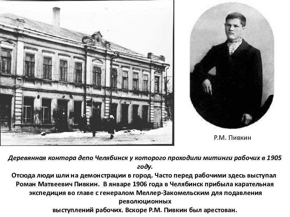Деревянная контора депо Челябинск у которого проходили митинги рабочих в 1905 году. Отсюда люди шли на демонстрации в город. Часто перед рабочими здесь выступал Роман Матвеевич Пивкин. В январе 1906 года в Челябинск прибыла карательная экспедиция во главе с генералом Меллер-Закомельским для подавления революционных выступлений рабочих. Вскоре Р.М. Пивкин был арестован. Р.М. Пивкин