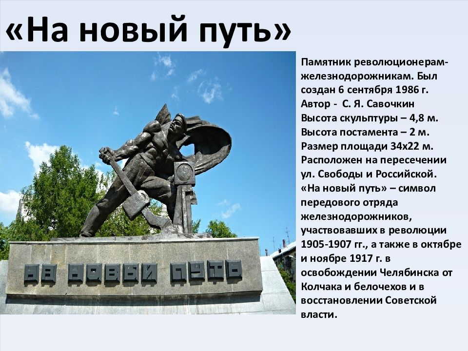 « На новый путь » Памятник революционерам-железнодорожникам. Был создан 6 сентября 1986 г. Автор - С. Я. Савочкин Высота скульптуры – 4,8 м. Высота постамента – 2 м. Размер площади 34х22 м. Расположен на пересечении ул. Свободы и Российской. «На новый путь» – символ передового отряда железнодорожников, участвовавших в революции 1905-1907 гг., а также в октябре и ноябре 1917 г. в освобождении Челябинска от Колчака и белочехов и в восстановлении Советской власти.
