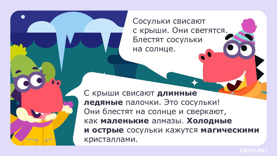 Сосульки свисают с крыши. Они светятся. Блестят сосульки на солнце. С крыши свисают длинные ледяные палочки. Это сосульки! Они блестят на солнце и сверкают, как маленькие алмазы. Холодные и острые сосульки кажутся магическими кристаллами.