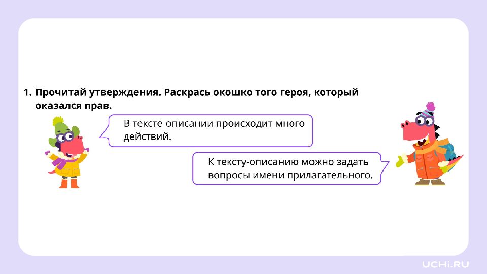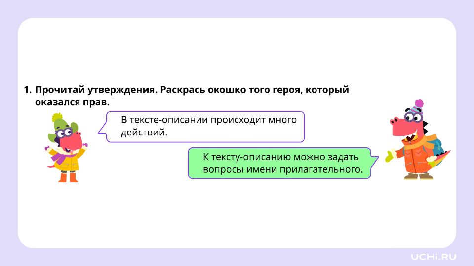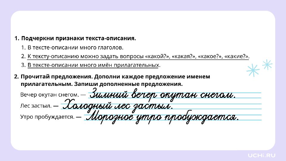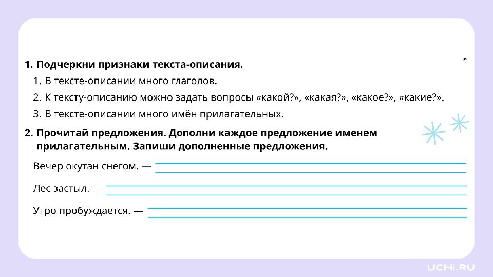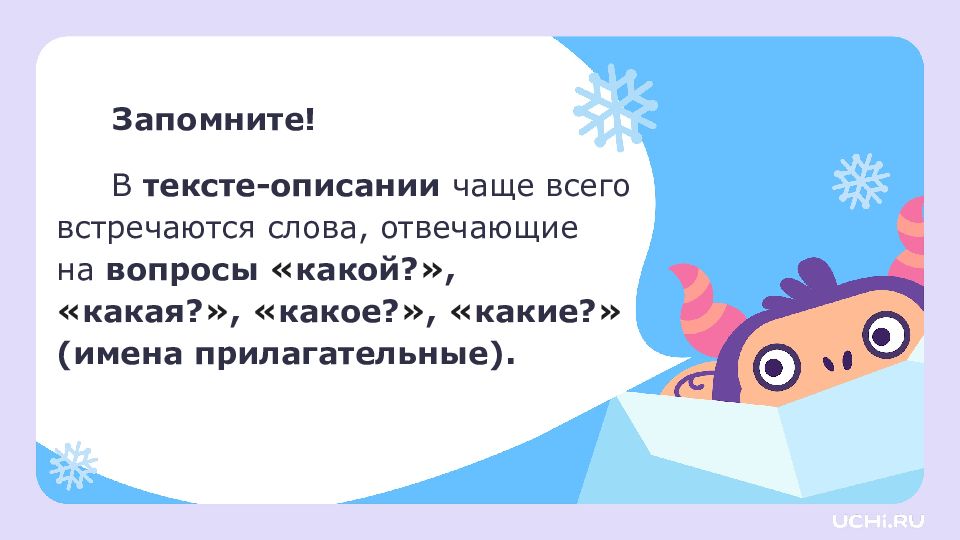 Запомните! В тексте-описании чаще всего встречаются слова, отвечающие на вопросы « какой? », « какая? », « какое? », « какие? » (имена прилагательные).