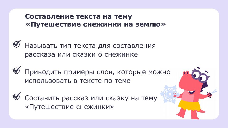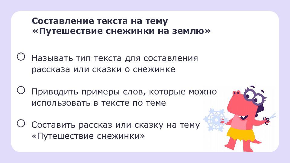 Составление текста на тему «Путешествие снежинки на землю» Называть тип текста для составления рассказа или сказки о снежинке Приводить примеры слов, которые можно использовать в тексте по теме Составить рассказ или сказку на тему « Путешествие снежинки »