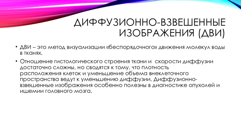 ДВИ – это метод визуализации «беспорядочного» движения молекул воды в тканях. Отношение гистологического строения ткани и скорости диффузии достаточно сложны, но сводятся к тому, что плотность расположения клеток и уменьшение объема внеклеточного пространства ведут к уменьшению диффузии. Диффузионно-взвешенные изображения особенно полезны в диагностике опухолей и ишемии головного мозга.