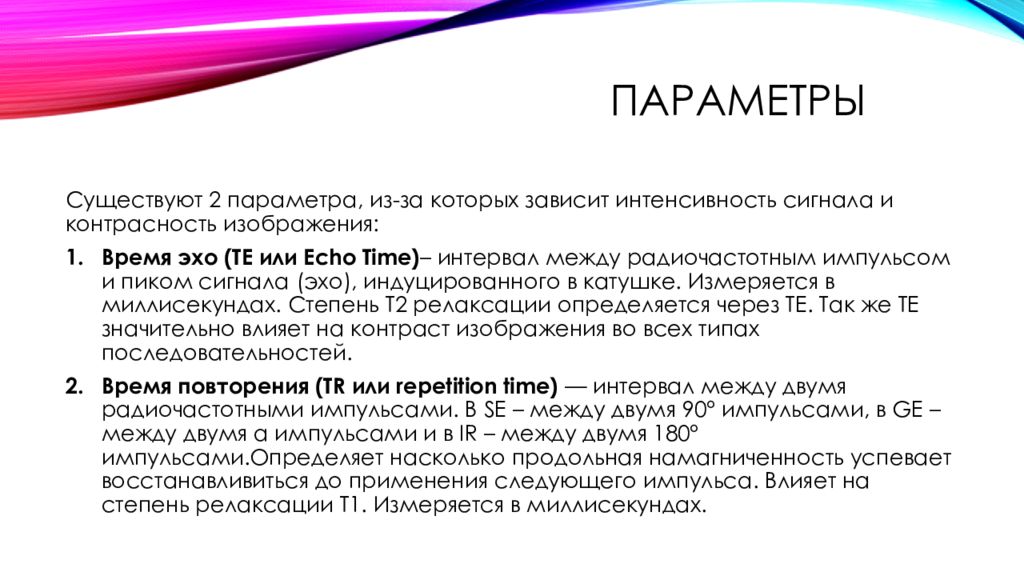Существуют 2 параметра, из-за которых зависит интенсивность сигнала и контрасность изображения: Время эхо (TE или Echo Time ) – интервал между радиочастотным импульсом и пиком сигнала (эхо), индуцированного в катушке. Измеряется в миллисекундах. Степень T2 релаксации определяется через TE. Так же TE значительно влияет на контраст изображения во всех типах последовательностей. Время повторения (TR или repetition time ) — интервал между двумя радиочастотными импульсами. В SE – между двумя 90° импульсами, в GE – между двумя α импульсами и в IR – между двумя 180° импульсами.Определяет насколько продольная намагниченность успевает восстанавливиться до применения следующего импульса. Влияет на степень релаксации Т1. Измеряется в миллисекундах.