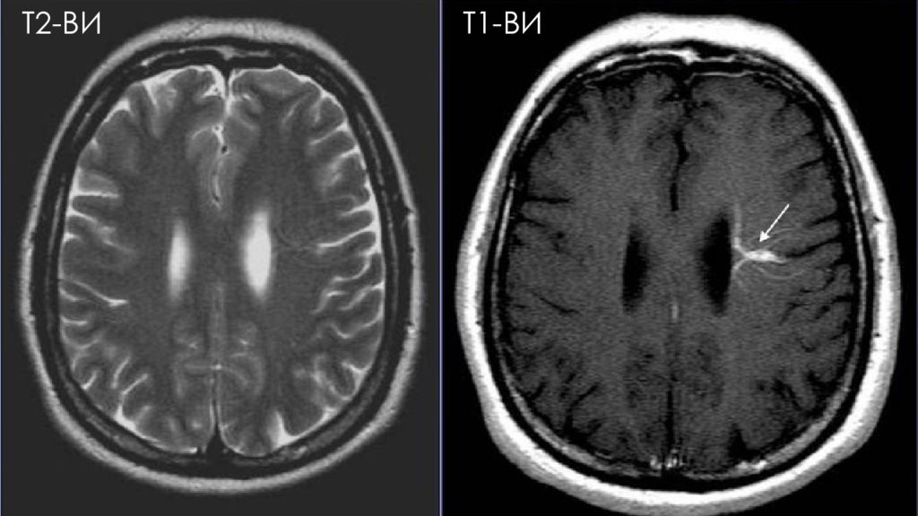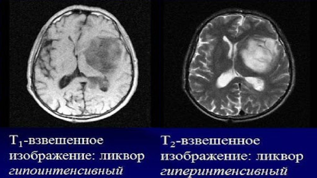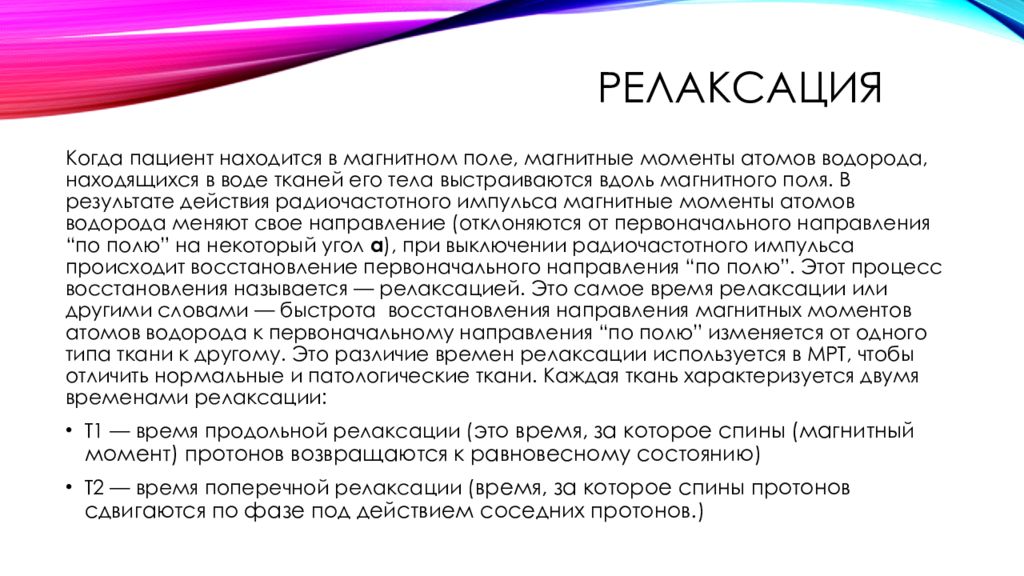 Когда пациент находится в магнитном поле, магнитные моменты атомов водорода, находящихся в воде тканей его тела выстраиваются вдоль магнитного поля. В результате действия радиочастотного импульса магнитные моменты атомов водорода меняют свое направление (отклоняются от первоначального направления “по полю” на некоторый угол а ), при выключении радиочастотного импульса происходит восстановление первоначального направления “по полю”. Этот процесс восстановления называется — релаксацией. Это самое время релаксации или другими словами — быстрота восстановления направления магнитных моментов атомов водорода к первоначальному направления “по полю” изменяется от одного типа ткани к другому. Это различие времен релаксации используется в МРТ, чтобы отличить нормальные и патологические ткани. Каждая ткань характеризуется двумя временами релаксации : T1 — время продольной релаксации ( это время, за которое спины (магнитный момент) протонов возвращаются к равновесному состоянию ) Т2 — время поперечной релаксации ( время, за которое спины протонов сдвигаются по фазе под действием соседних протонов. )