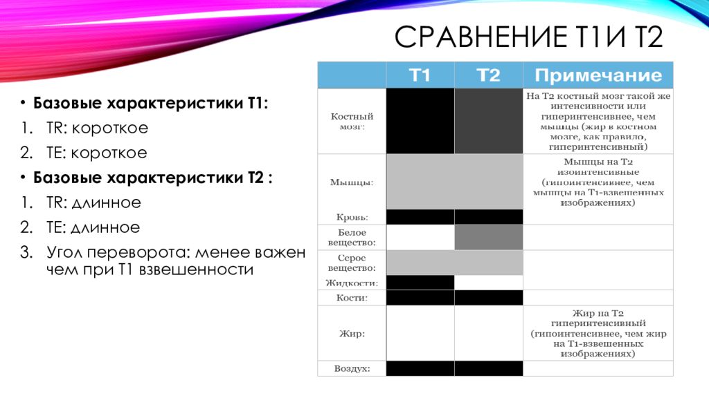 Базовые характеристики Т1: TR: короткое TE: короткое Базовые характеристики Т2 : TR: длинное TE: длинное Угол переворота: менее важен чем при T1 взвешенности