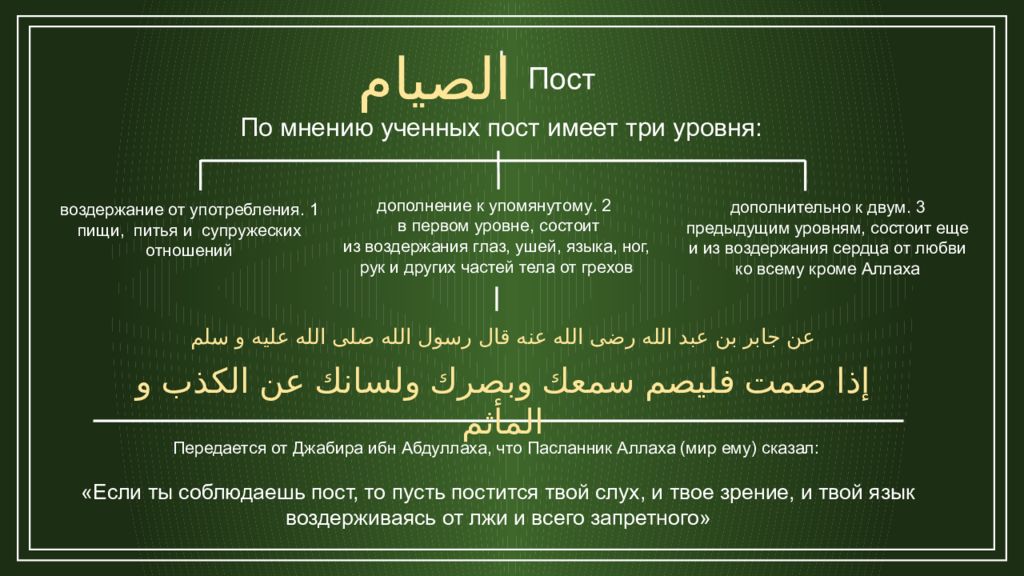 Пост По мнению ученных пост имеет три уровня: الصيام 3. дополнительно к двум предыдущим уровням, состоит еще и из воздержания сердца от любви ко всему кроме Аллаха 2. дополнение к упомянутому в первом уровне, состоит из воздержания глаз, ушей, языка, ног, рук и других частей тела от грехов 1. воздержание от употребления пищи, питья и супружеских отношений عن جابر بن عبد الله رضى الله عنه قال رسول الله صلى الله عليه و سلم إذا صمت فليصم سمعك وبصرك ولسانك عن الكذب و المأثم Передается от Джабира ибн Абдуллаха, что Пасланник Аллаха (мир ему) сказал: «Если ты соблюдаешь пост, то пусть постится твой слух, и твое зрение, и твой язык воздерживаясь от лжи и всего запретного»