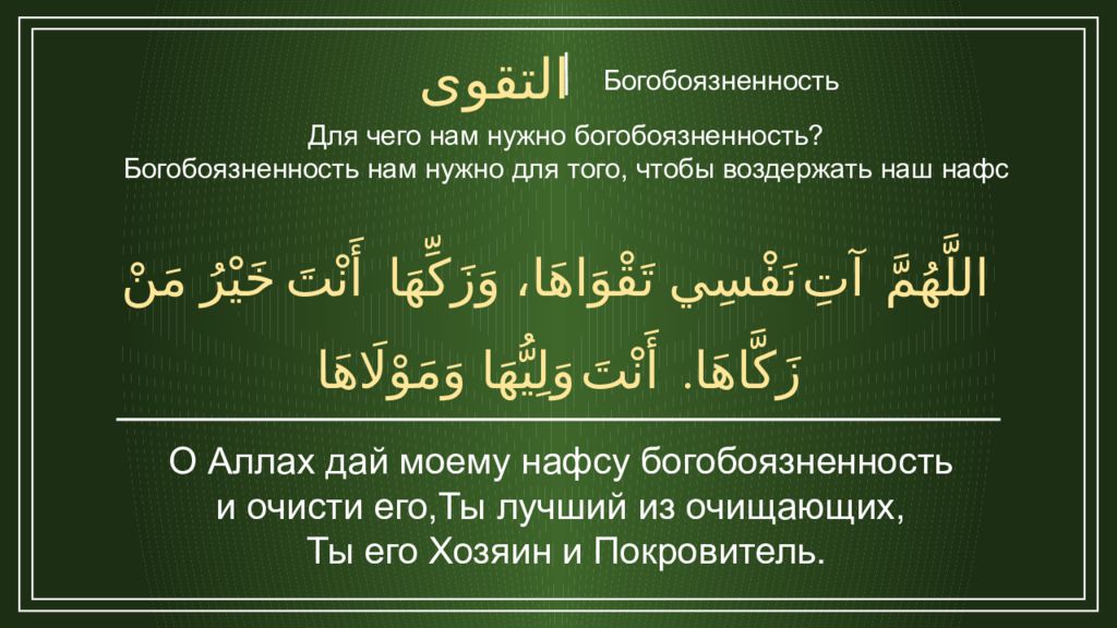 Богобоязненность اللَّهُمَّ آتِ نَفْسِي تَقْوَاهَا، وَزَكِّهَا أَنْتَ خَيْرُ مَنْ زَكَّاهَا. أَنْتَ وَلِيُّهَا وَمَوْلَاهَا Для чего нам нужно богобоязненность? Богобоязненность нам нужно для того, чтобы воздержать наш нафс التقوى О Аллах дай моему нафсу богобоязненность и очисти его,Ты лучший из очищающих, Ты его Хозяин и Покровитель.