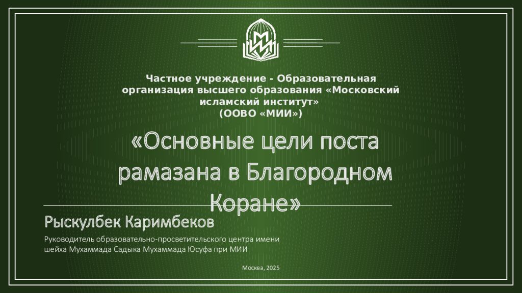 Рыскулбек Каримбеков Москва, 20 25 Частное учреждение - Образовательная организация высшего образования «Московский исламский институт» (ООВО «МИИ») « Основные цели поста рамазана в Благородном Коране » Руководитель образовательно-просветительского центра имени шейха Мухаммада Садыка Мухаммада Юсуфа при МИИ
