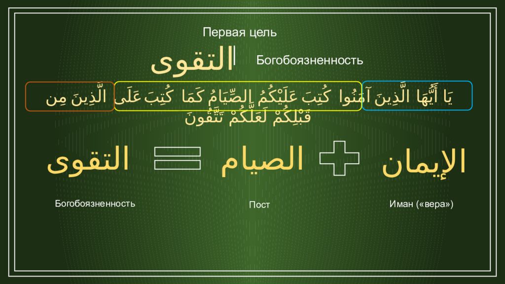 Б огобоязненность التقوى يَا أَيُّهَا الَّذِينَ آمَنُوا كُتِبَ عَلَيْكُمُ الصِّيَامُ كَمَا كُتِبَ عَلَى الَّذِينَ مِن قَبْلِكُمْ لَعَلَّكُمْ تَتَّقُونَ Иман («вера») Первая цель الإيم ان الصيام التقوى Пост Богобоязненность