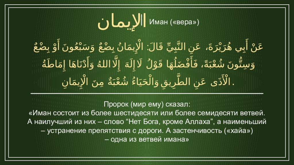 Иман («вера») عَنْ أَبِي هُرَيْرَةَ، عَنِ النَّبِيِّ قَالَ: الْإِيمَانُ بِضْعٌ وَسَبْعُونَ أَوْ بِضْعٌ وَسِتُّونَ شُعْبَةً، فَأَفْضَلُهَا قَوْلُ لَا إِلَهَ إِلَّا اللهُ وَأَدْنَاهَا إِمَاطَةُ الْأَذَى عَنِ الطَّرِيقِ وَالْحَيَاءُ شُعْبَةٌ مِنَ الْإِيمَانِ. Пророк (мир ему) сказал: «Иман состоит из более шестидесяти или более семидесяти ветвей. А наилучший из них – слово “Нет Бога, кроме Аллаха”, а наименьший – устранение препятствия с дороги. А застенчивость («хайа») – одна из ветвей имана» الإيمان