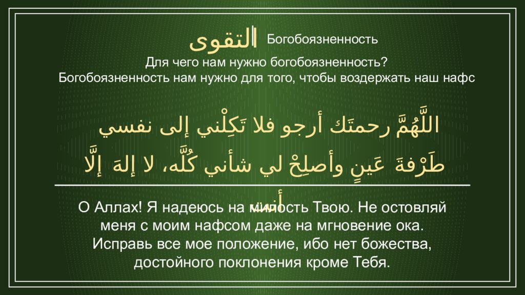Богобоязненность اللَّهُمَّ رحمتَك أرجو فلا تَكِلْني إلى نفسي طَرْفةَ عَينٍ وأصلِحْ لي شأني كُلَّه، لا إلهَ إلَّا أنت Для чего нам нужно богобоязненность? Богобоязненность нам нужно для того, чтобы воздержать наш нафс التقوى О Аллах! Я надеюсь на милость Твою. Не остовляй меня с моим нафсом даже на мгновение ока. Исправь все мое положение, ибо нет божества, достойного поклонения кроме Тебя.
