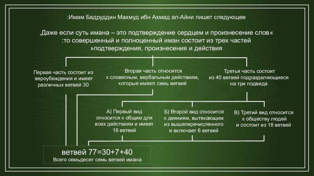 Имам Бадруддин Махмуд ибн Ахмад ал-Айни пишет следующее: «Даже если суть имана – это подтверждение сердцем и произнесение слов, то совершенный и полноценный иман состоит из трех частей: подтверждения, произнесения и действия» Третья часть состоит из 40 ветвей подразделяющиеся на три подвида Вторая часть относится к словесным, вербальным действиям, которые имеют семь ветвей Первая часть состоит из вероубеждения и имеет 30 различных ветвей В) Третий вид относится к обществу людей и состоит из 18 ветвей Б) Второй вид относится к деяниям, вытекающим из вышеперечисленного и включает 6 ветвей А) Первый вид относится к общим для всех действиям и имеет 16 ветвей 30+7+40=77 ветвей Всего семьдесят семь ветвей имана