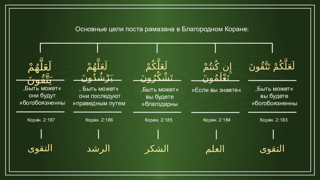 Основные цели поста рамазана в Благородном Коране: لَعَلَّكُمْ تَتَّقُونَ «Быть может, вы будете богобоязненны» التقوى Коран. 2:183 إِن كُنتُمْ تَعْلَمُونَ «Если вы знаете» العلم Коран. 2:184 لَعَلَّكُمْ تَشْكُرُونَ «Быть может, вы будете благодарны» الشكر Коран. 2:185 لَعَلَّهُمْ يَرْشُدُونَ «Быть может, они последуют праведным путем» الرشد Коран. 2:186 لَعَلَّهُمْ يَتَّقُونَ «Быть может, они будут богобоязненны» التقوى Коран. 2:187