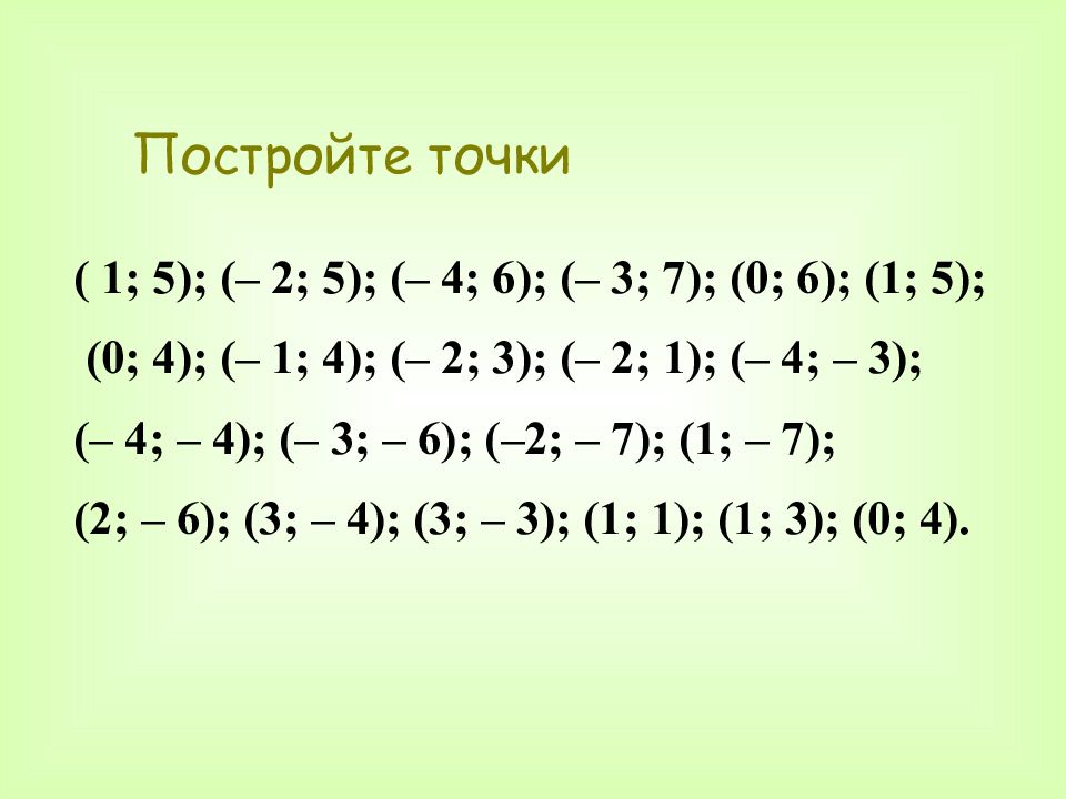 Постройте точки ( 1; 5); (– 2; 5); (– 4; 6); (– 3; 7); (0; 6); (1; 5); (0; 4); (– 1; 4); (– 2; 3); (– 2; 1); (– 4; – 3); (– 4; – 4); (– 3; – 6); (–2; – 7); (1; – 7); (2; – 6); (3; – 4); (3; – 3); (1; 1); (1; 3); (0; 4).
