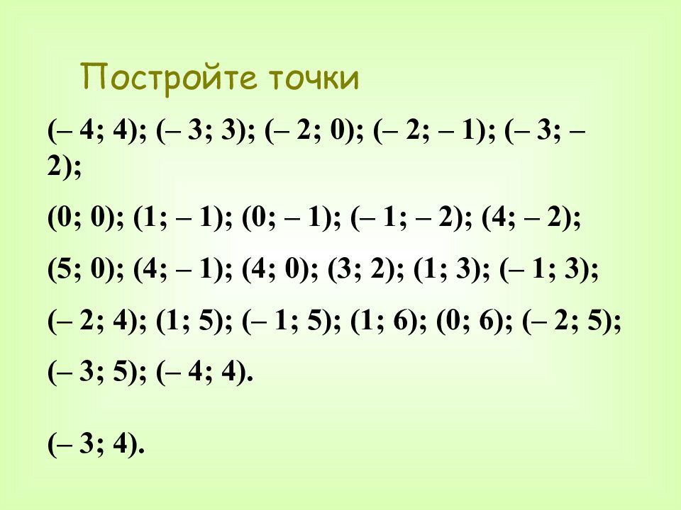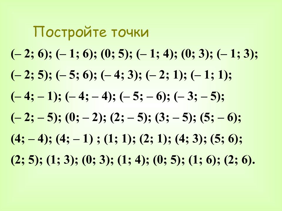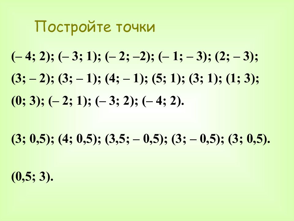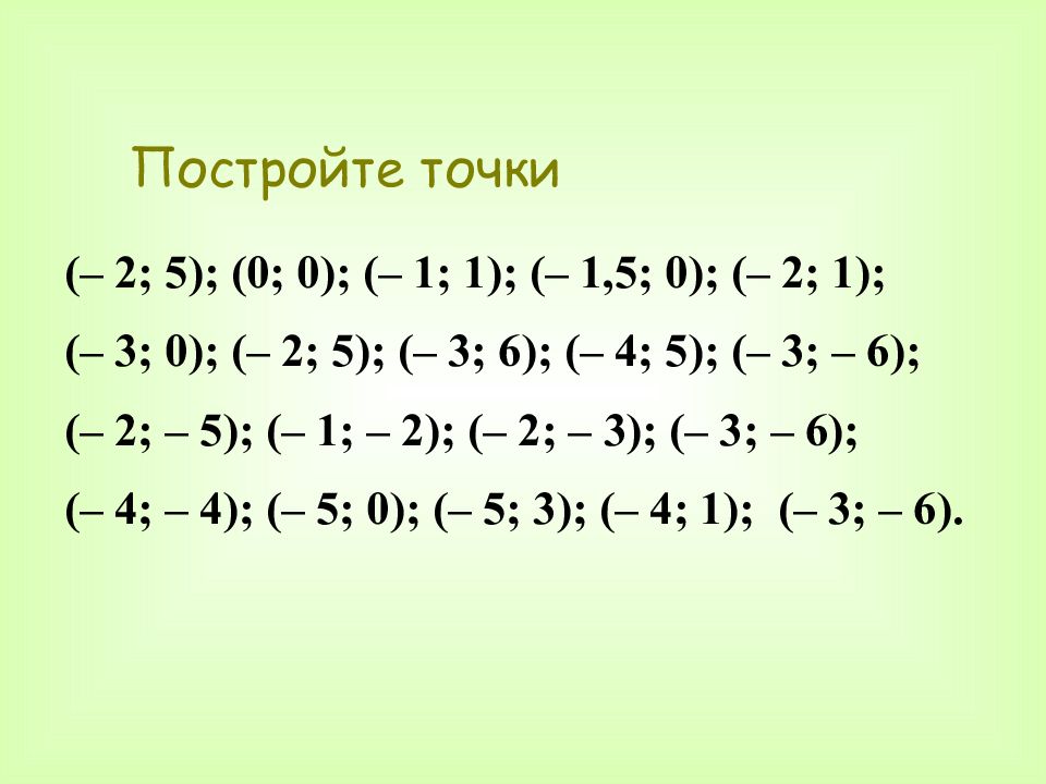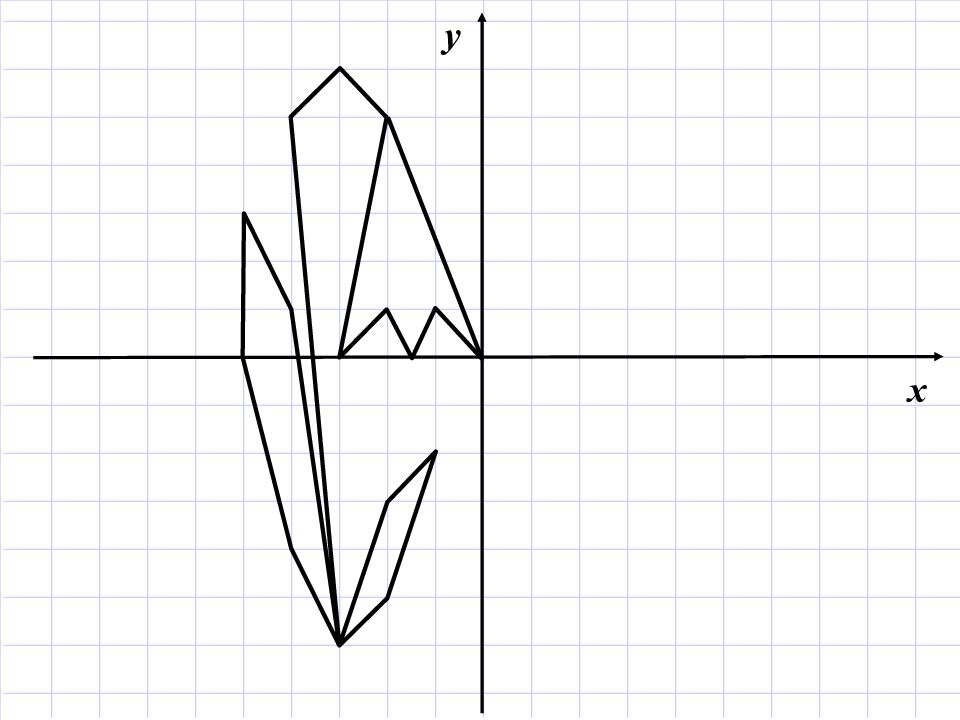 Постройте точки (– 2; 5); (0; 0); (– 1; 1); (– 1,5; 0); (– 2; 1); (– 3; 0); (– 2; 5); (– 3; 6); (– 4; 5); (– 3; – 6); (– 2; – 5); (– 1; – 2); (– 2; – 3); (– 3; – 6); (– 4; – 4); (– 5; 0); (– 5; 3); (– 4; 1); (– 3; – 6).