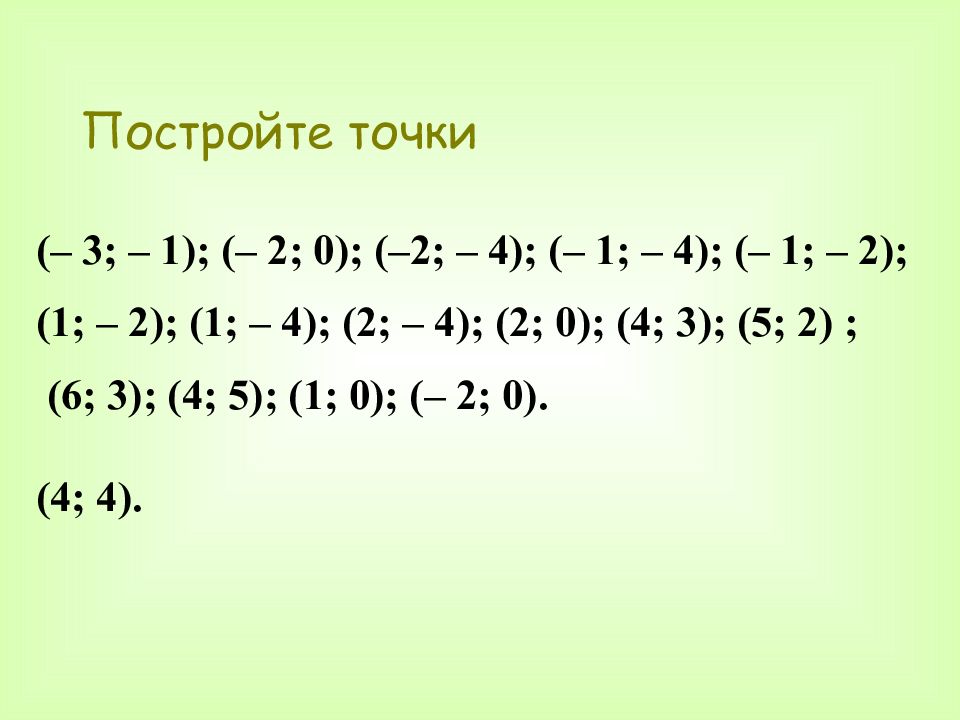 Постройте точки (– 3; – 1); (– 2; 0); (–2; – 4); (– 1; – 4); (– 1; – 2); (1; – 2); (1; – 4); (2; – 4); (2; 0); (4; 3); (5; 2) ; (6; 3); (4; 5); (1; 0); (– 2; 0). (4; 4).