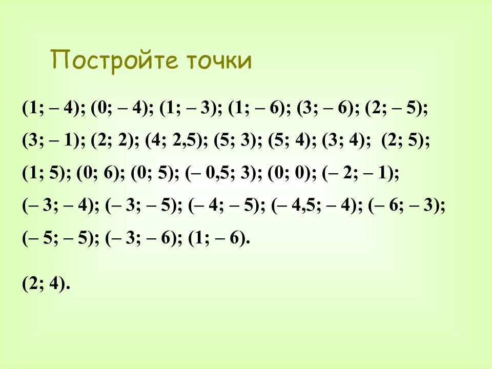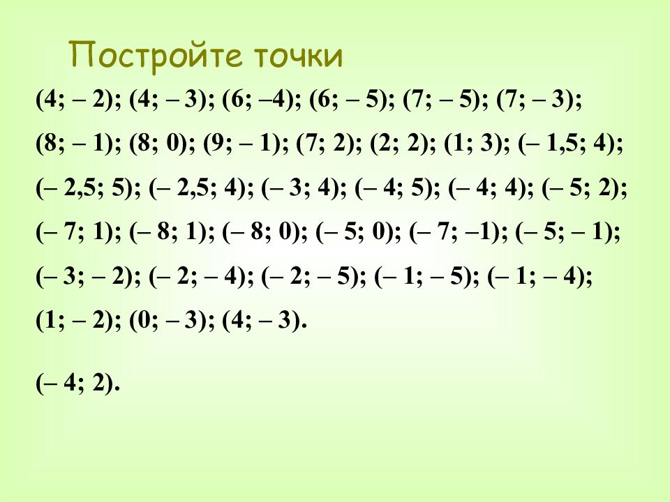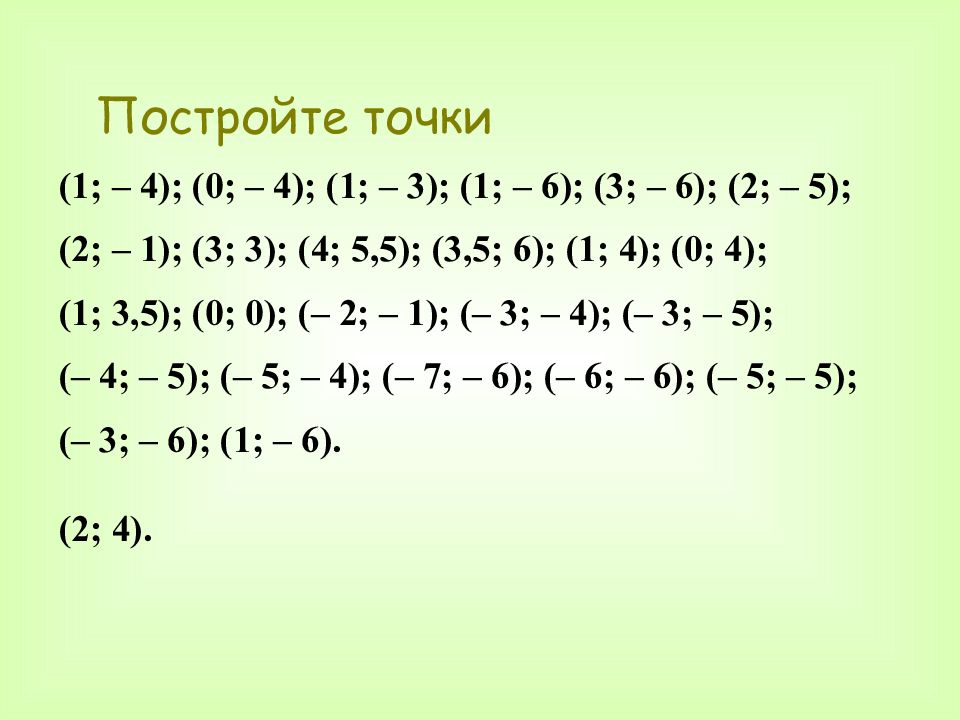 Постройте точки (1; – 4); (0; – 4); (1; – 3); (1; – 6); (3; – 6); (2; – 5); (3; – 1); (2; 2); (4; 2,5); (5; 3); (5; 4); (3; 4); (2; 5); (1; 5); (0; 6); (0; 5); (– 0,5; 3); (0; 0); (– 2; – 1); (– 3; – 4); (– 3; – 5); (– 4; – 5); (– 4,5; – 4); (– 6; – 3); (– 5; – 5); (– 3; – 6); (1; – 6). (2; 4).