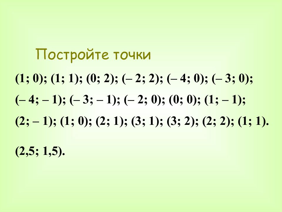 Постройте точки (1; 0); (1; 1); (0; 2); (– 2; 2); (– 4; 0); (– 3; 0); (– 4; – 1); (– 3; – 1); (– 2; 0); (0; 0); (1; – 1); (2; – 1); (1; 0); (2; 1); (3; 1); (3; 2); (2; 2); (1; 1). (2,5; 1,5).