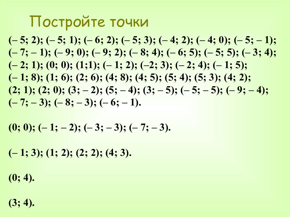 Постройте точки (– 5; 2); (– 5; 1); (– 6; 2); (– 5; 3); (– 4; 2); (– 4; 0); (– 5; – 1); (– 7; – 1); (– 9; 0); (– 9; 2); (– 8; 4); (– 6; 5); (– 5; 5); (– 3; 4); (– 2; 1); (0; 0); (1;1); (– 1; 2); (–2; 3); (– 2; 4); (– 1; 5); (– 1; 8); (1; 6); (2; 6); (4; 8); (4; 5); (5; 4); (5; 3); (4; 2); (2; 1); (2; 0); (3; – 2); (5; – 4); (3; – 5); (– 5; – 5); (– 9; – 4); (– 7; – 3); (– 8; – 3); (– 6; – 1). (0; 0); (– 1; – 2); (– 3; – 3); (– 7; – 3). (– 1; 3); (1; 2); (2; 2); (4; 3). (0; 4). (3; 4).