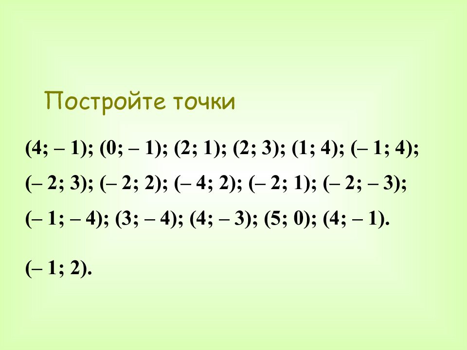 Постройте точки (4; – 1); (0; – 1); (2; 1); (2; 3); (1; 4); (– 1; 4); (– 2; 3); (– 2; 2); (– 4; 2); (– 2; 1); (– 2; – 3); (– 1; – 4); (3; – 4); (4; – 3); (5; 0); (4; – 1). (– 1; 2).