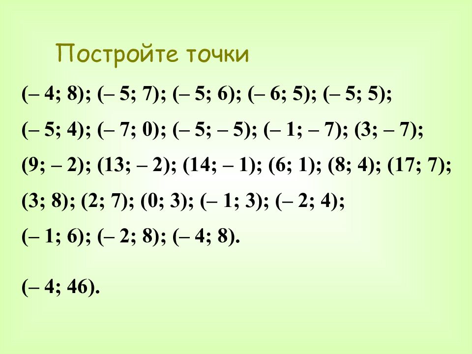 Постройте точки (– 4; 8); (– 5; 7); (– 5; 6); (– 6; 5); (– 5; 5); (– 5; 4); (– 7; 0); (– 5; – 5); (– 1; – 7); (3; – 7); (9; – 2); (13; – 2); (14; – 1); (6; 1); (8; 4); (17; 7); (3; 8); (2; 7); (0; 3); (– 1; 3); (– 2; 4); (– 1; 6); (– 2; 8); (– 4; 8). (– 4; 46).