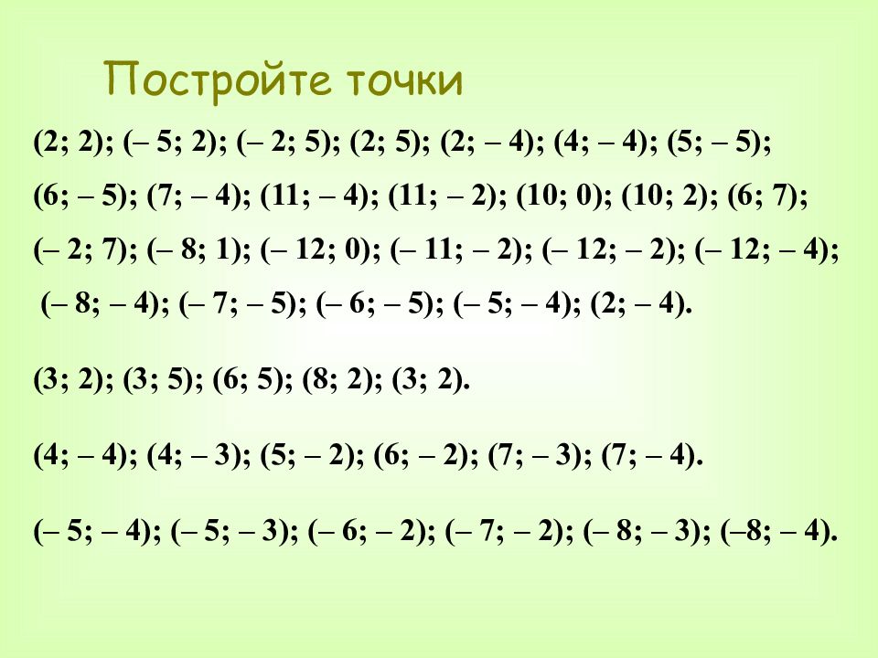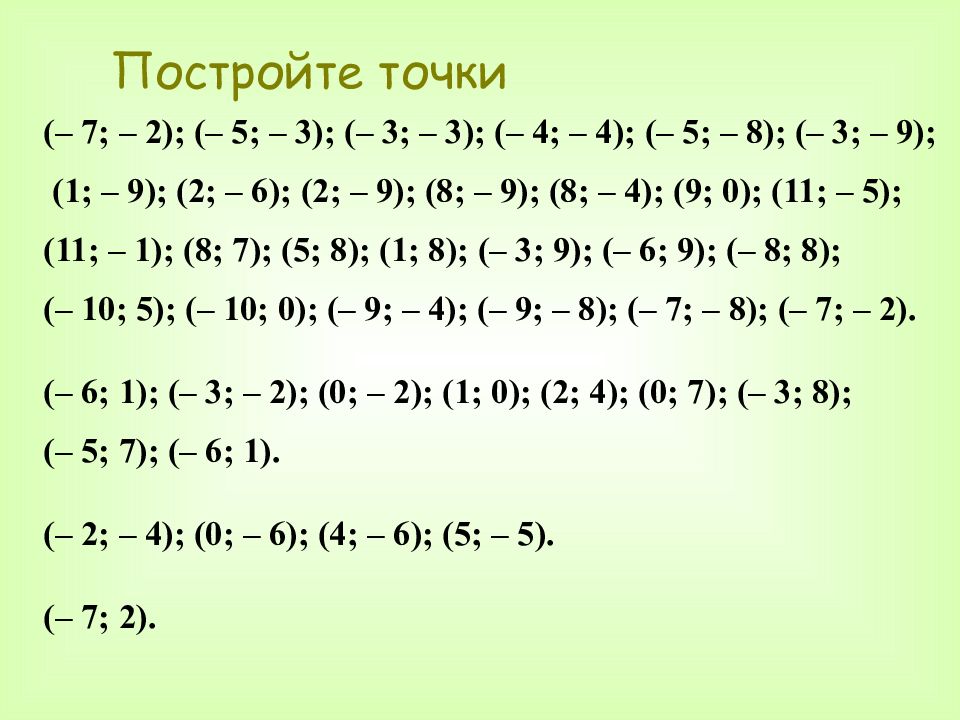 Постройте точки (– 7; – 2); (– 5; – 3); (– 3; – 3); (– 4; – 4); (– 5; – 8); (– 3; – 9); (1; – 9); (2; – 6); (2; – 9); (8; – 9); (8; – 4); (9; 0); (11; – 5); (11; – 1); (8; 7); (5; 8); (1; 8); (– 3; 9); (– 6; 9); (– 8; 8); (– 10; 5); (– 10; 0); (– 9; – 4); (– 9; – 8); (– 7; – 8); (– 7; – 2). (– 6; 1); (– 3; – 2); (0; – 2); (1; 0); (2; 4); (0; 7); (– 3; 8); (– 5; 7); (– 6; 1). (– 2; – 4); (0; – 6); (4; – 6); (5; – 5). (– 7; 2).