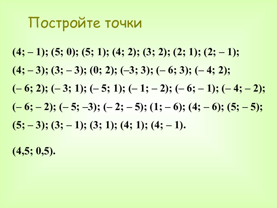 Постройте точки (4; – 1); (5; 0); (5; 1); (4; 2); (3; 2); (2; 1); (2; – 1); (4; – 3); (3; – 3); (0; 2); (–3; 3); (– 6; 3); (– 4; 2); (– 6; 2); (– 3; 1); (– 5; 1); (– 1; – 2); (– 6; – 1); (– 4; – 2); (– 6; – 2); (– 5; –3); (– 2; – 5); (1; – 6); (4; – 6); (5; – 5); (5; – 3); (3; – 1); (3; 1); (4; 1); (4; – 1). (4,5; 0,5).