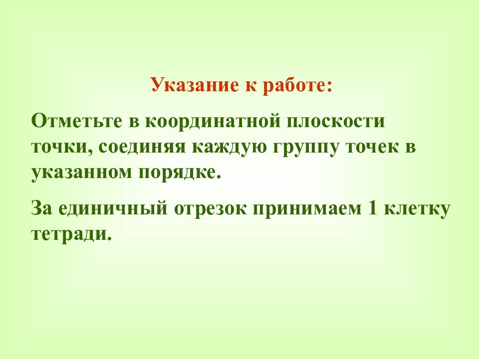 Указание к работе: Отметьте в координатной плоскости точки, соединяя каждую группу точек в указанном порядке. За единичный отрезок принимаем 1 клетку тетради.