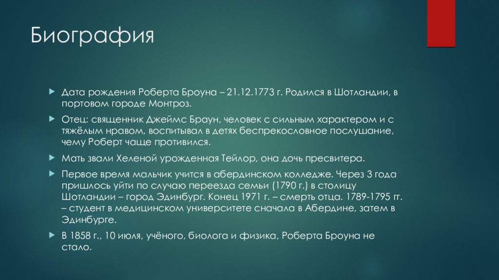 Дата рождения Роберта Броуна – 21.12.1773 г. Родился в Шотландии, в портовом городе Монтроз. Отец: священник Джеймс Браун, человек с сильным характером и с тяжёлым нравом, воспитывал в детях беспрекословное послушание, чему Роберт чаще противился. Мать звали Хеленой урожденная Тейлор, она дочь пресвитера. Первое время мальчик учится в абердинском колледже. Через 3 года пришлось уйти по случаю переезда семьи (1790 г.) в столицу Шотландии – город Эдинбург. Конец 1971 г. – смерть отца. 1789-1795 гг. – студент в медицинском университете сначала в Абердине, затем в Эдинбурге. В 1858 г., 10 июля, учёного, биолога и физика, Роберта Броуна не стало.