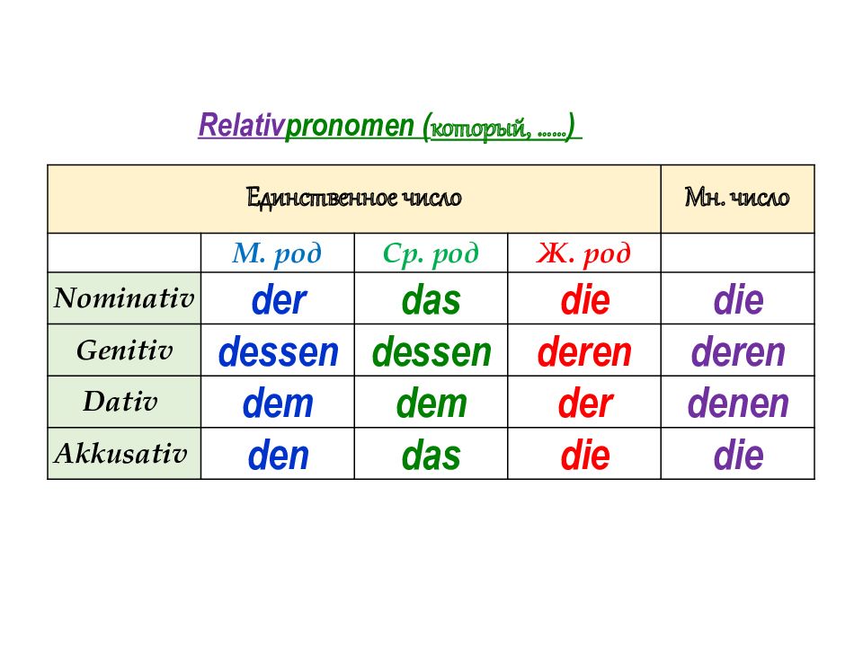 Единственное число Мн. числ o М. род Ср. род Ж. род Nominativ der d as die die Genitiv dessen dessen deren deren Dativ dem dem der denen Akkusativ den das die die Relativ pronomen ( который, …… )