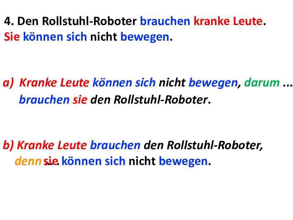 4. Den Rollstuhl-Roboter brauchen kranke Leute. Sie können sich nicht bewegen. Kranke Leute können sich nicht bewegen, darum... brauchen sie den Rollstuhl-Roboter. b) Kranke Leute brauchen den Rollstuhl-Roboter, denn …. sie können sich nicht bewegen.
