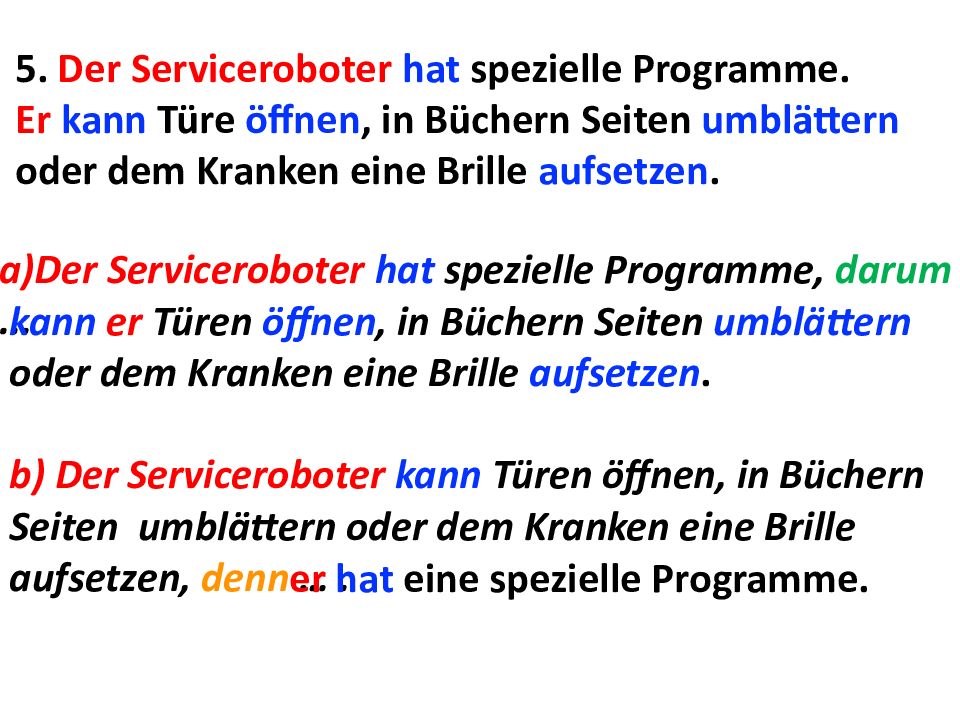 5. Der Serviceroboter hat spezielle Programme. Er kann Türe öffnen, in Büchern Seiten umblättern oder dem Kranken eine Brille aufsetzen. a)Der Serviceroboter hat spezielle Programme, darum ... kann er Türen öffnen, in Büchern Seiten umblättern oder dem Kranken eine Brille aufsetzen. b) Der Serviceroboter kann Türen öffnen, in Büchern Seiten umblättern oder dem Kranken eine Brille aufsetzen, denn …. er hat eine spezielle Programme.