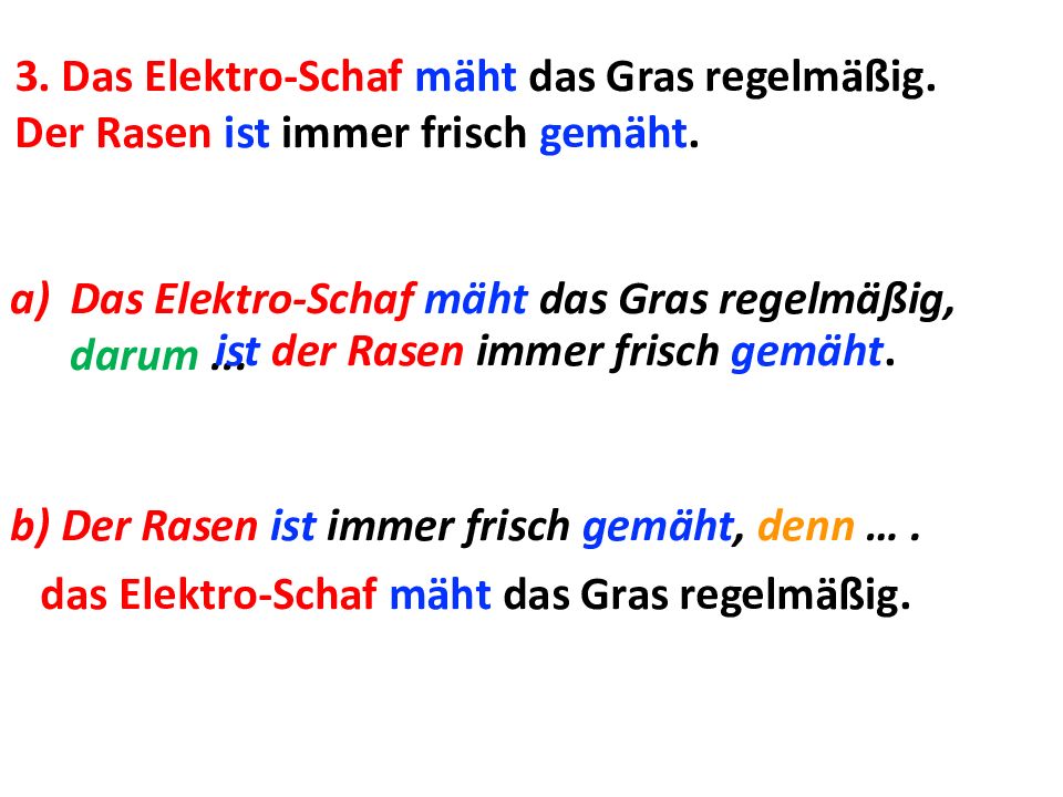 3. Das Elektro-Schaf mäht das Gras regelmäßig. Der Rasen ist immer frisch gemäht. Das Elektro-Schaf mäht das Gras regelmäßig, darum... ist der Rasen immer frisch gemäht. b) Der Rasen ist immer frisch gemäht, denn …. das Elektro-Schaf mäht das Gras regelmäßig.