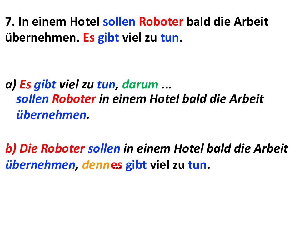 7. In einem Hotel sollen Roboter bald die Arbeit übernehmen. Es gibt viel zu tun. a) Es gibt viel zu tun, darum... sollen Roboter in einem Hotel bald die Arbeit übernehmen. b) Die Roboter sollen in einem Hotel bald die Arbeit übernehmen, denn …. es gibt viel zu tun.