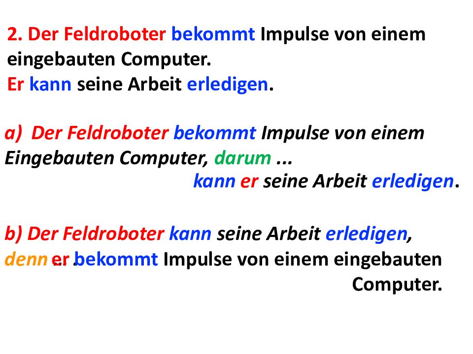 2. Der Feldroboter bekommt Impulse von einem eingebauten Computer. Er kann seine Arbeit erledigen. Der Feldroboter bekommt Impulse von einem Eingebauten Computer, darum... kann er seine Arbeit erledigen. b) Der Feldroboter kann seine Arbeit erledigen, denn …. er bekommt Impulse von einem eingebauten Computer.