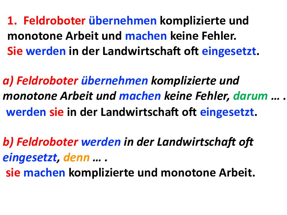 Feldroboter übernehmen komplizierte und monotone Arbeit und machen keine Fehler. Sie werden in der Landwirtschaft oft eingesetzt. a) Feldroboter übernehmen komplizierte und m onotone Arbeit und machen keine Fehler, darum …. werden sie in der Landwirtschaft oft eingesetzt. b) Feldroboter werden in der Landwirtschaft oft eingesetzt, denn …. sie machen komplizierte und monotone Arbeit.