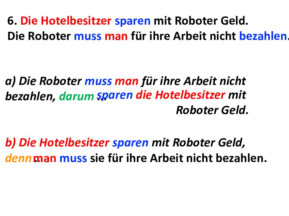 6. Die Hotelbesitzer sparen mit Roboter Geld. Die Roboter muss man für ihre Arbeit nicht bezahlen. a) Die Roboter muss man für ihre Arbeit nicht bezahlen, darum... sparen die Hotelbesitzer mit Roboter Geld. b) Die Hotelbesitzer sparen mit Roboter Geld, denn …. man muss sie für ihre Arbeit nicht bezahlen.